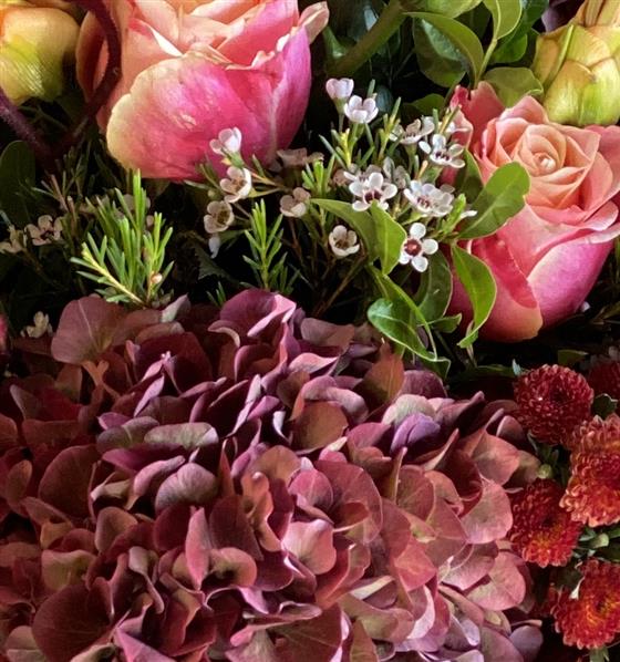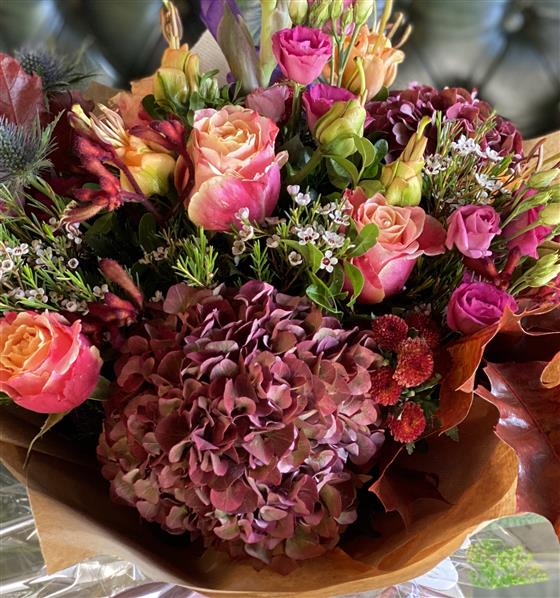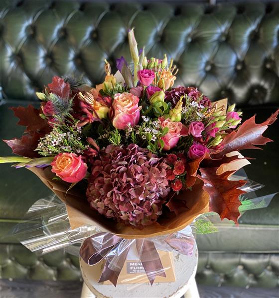 A large bouquet of Autumnal flowers including Roses, & Hydrangeas.
