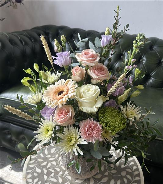A delightful arrangement in shades of pink, purple & greens beautifully arranged in a funky pot.