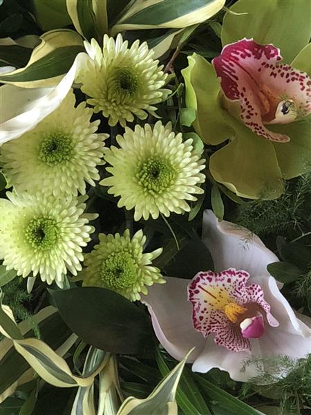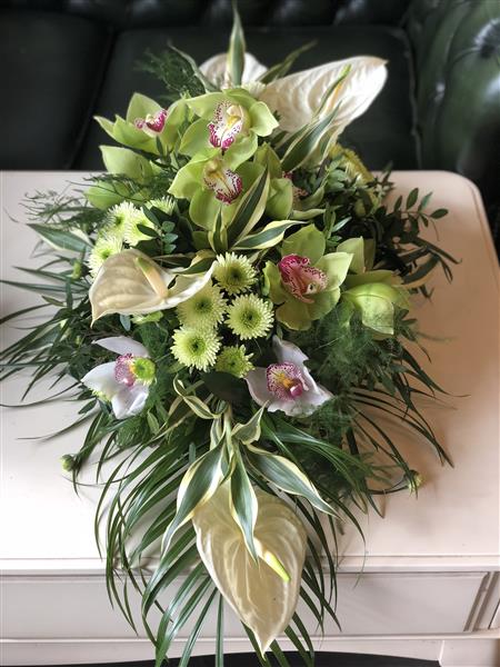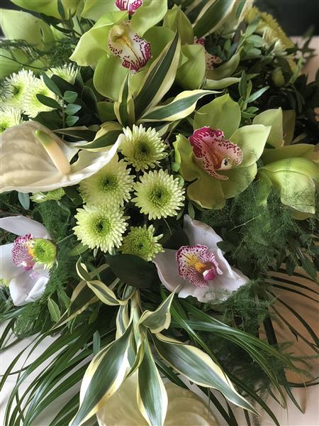 A contemporary single ended spray of the most beautiful exotic flowers including orchids.