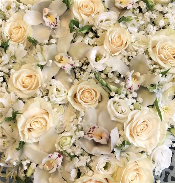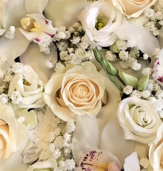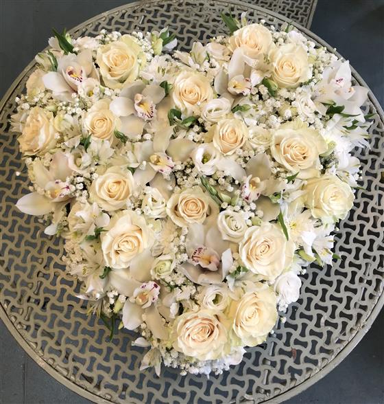 All in white beautiful and elegant heart including white large headed roses and cymbidium orchids. This heart can be made in different colours on request.