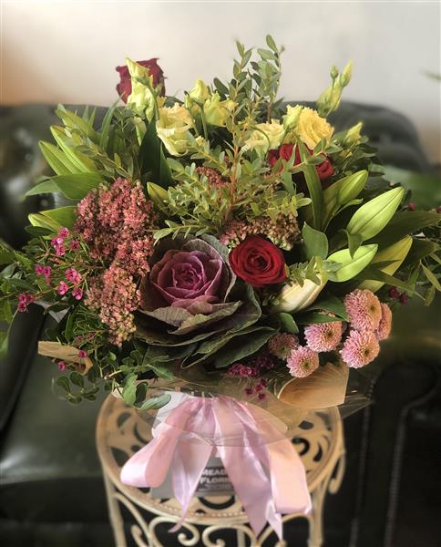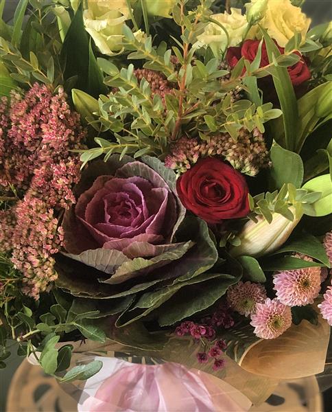 A romantic autumnal bouquet of flowers including dark pinks and reds.