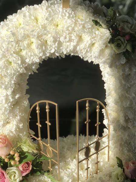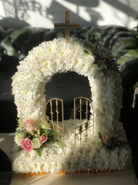 A massed tribute of white chrysanthemums with sprays available in your choice of colour.