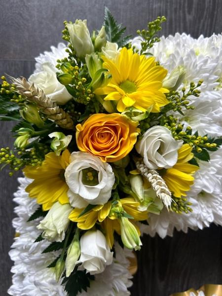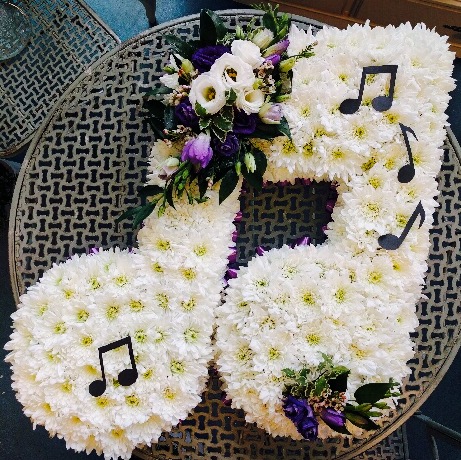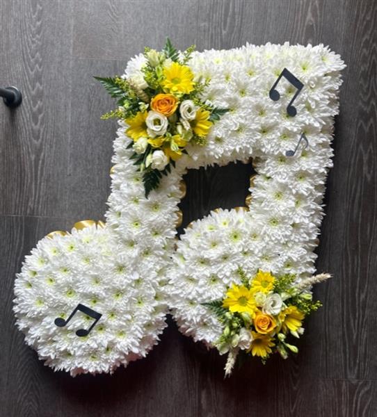 Our open musical note has a massed white chrysanthemum base with a ribbon surround and two mixed sprays of flowers available in a range of colours.