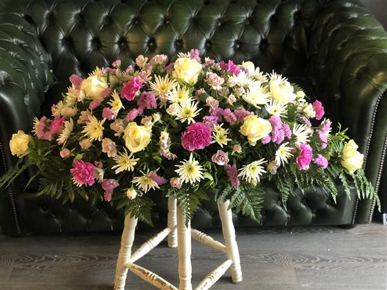 A feminine casket spray including a selection of pink blooms in a variety of shades and different types of roses.
