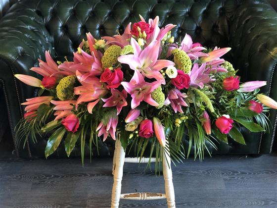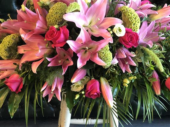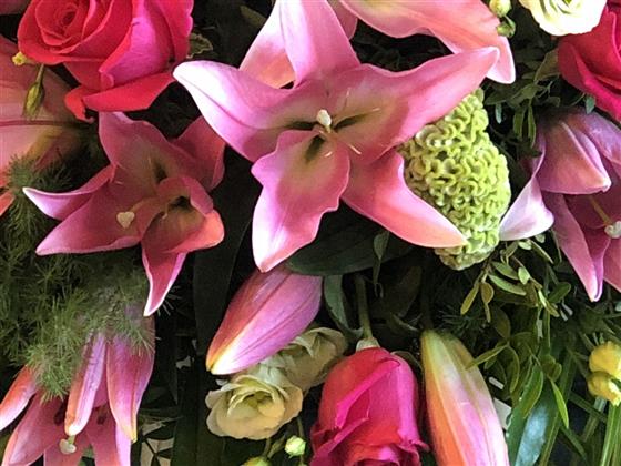 A stunning 4ft pink lily & rose casket spray including green viburnum.