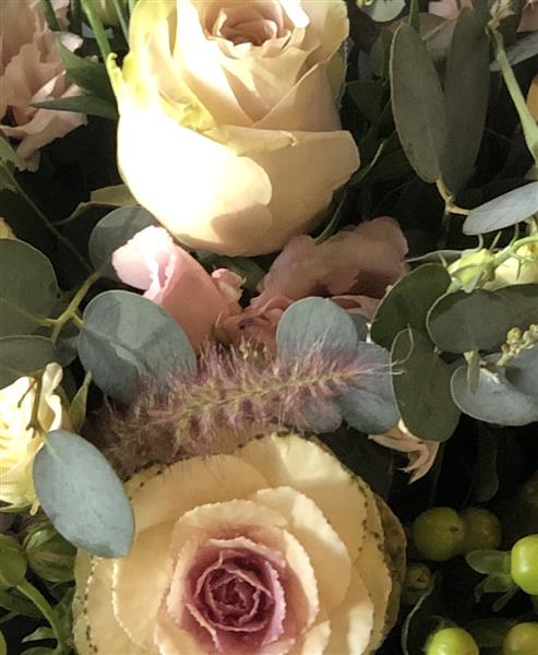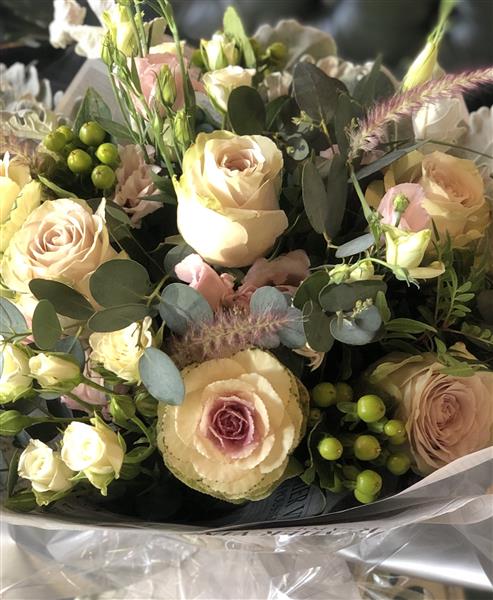 A winter bouquet of seasonal flowers in blush, nude tones.