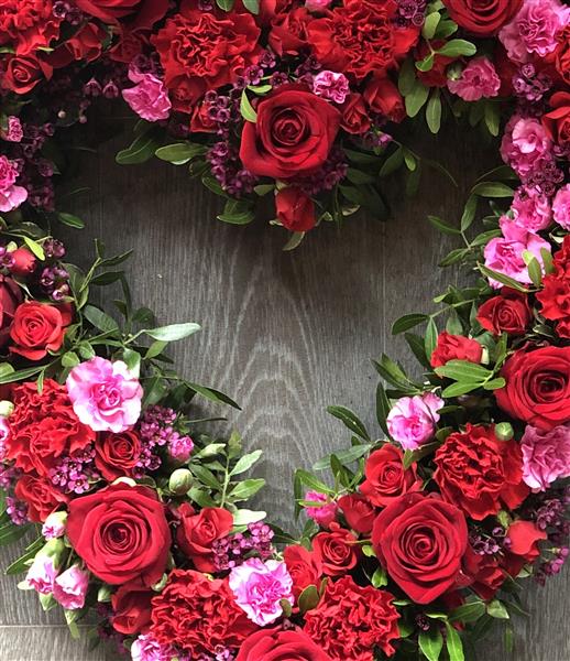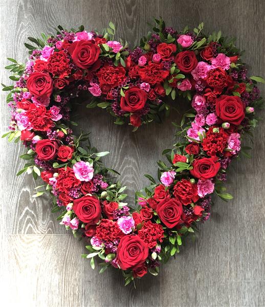 A selection of unusual greenery forms the base of this mixed open heart tribute. Available as pictured or in your choice of colous.