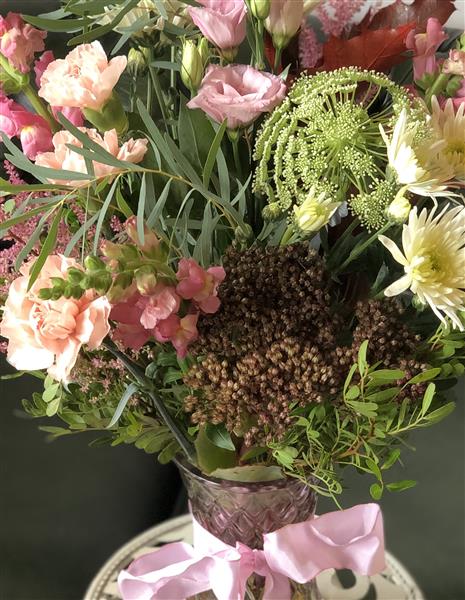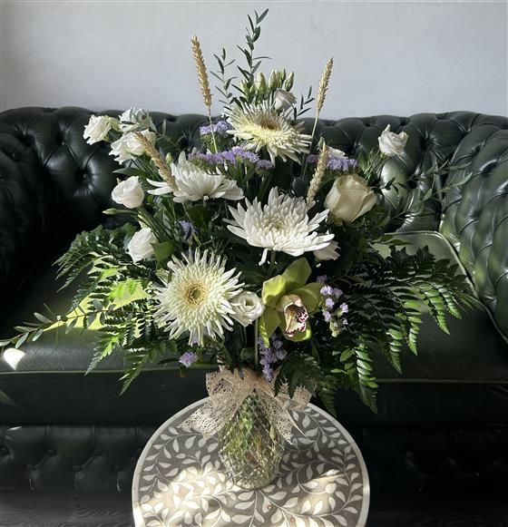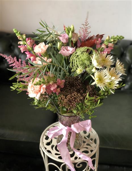 A garden inspired vase arrangement including lisianthus, carnations and eucalyptus presented in a chic glass vase.