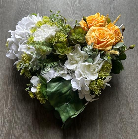 A small artificial heart tribute made of the most beautiful silk flowers and greenery.