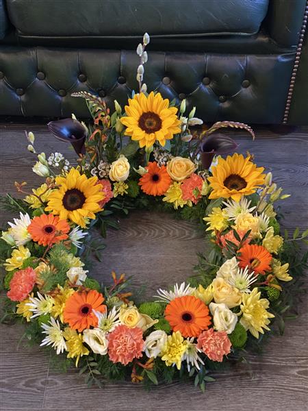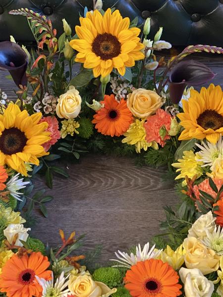 This beautiful wreath combines a combination of flowers to create a staged look tribute.