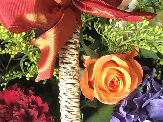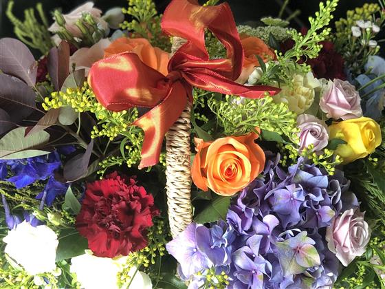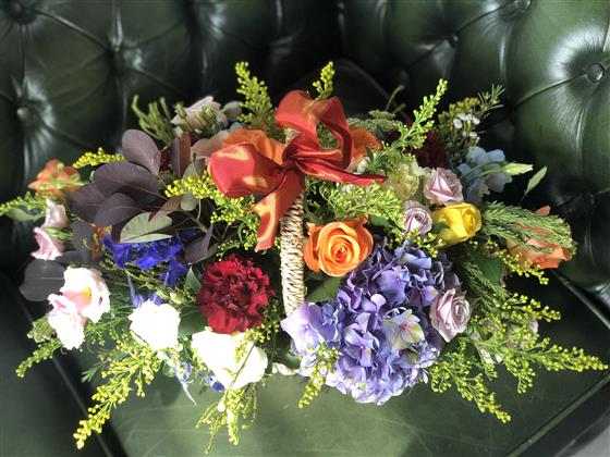 An explosion specially selected summer flowers, spilling out of a rustic basket. This beautifully arranged display makes for an extra special gift.