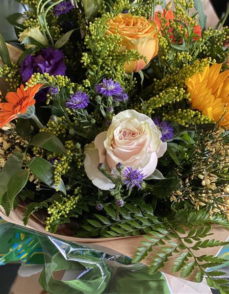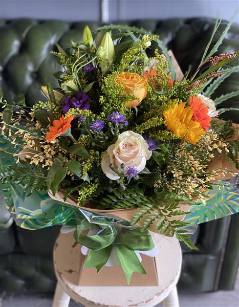 A beautiful domed hand tied bouquet in summery colours, with unusual and seasonal foliages and fillers. Delivered in water, this is sure to brighten up someones day!