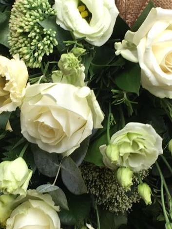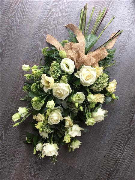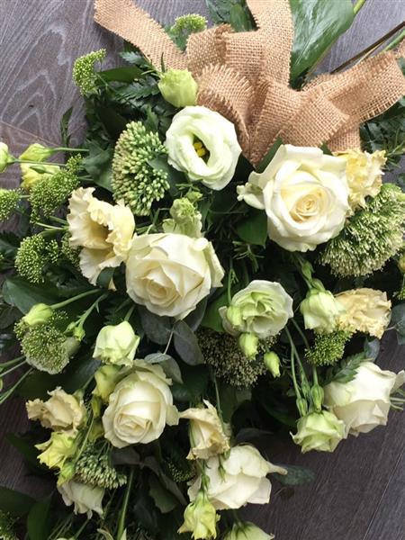 A stunning white sheaf made of the most beautiful white roses and green lisianthus.